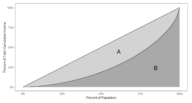 This curve is the basis for the Gini Coefficient, which was first developed by Corrado Gini in 1912. The Gini Coefficient is defined as the ratio of the area between the perfect equality curve and the Lorenz Curve divided by the total area under the perfect equality curve. In the image above that is equal to A / (A + B).